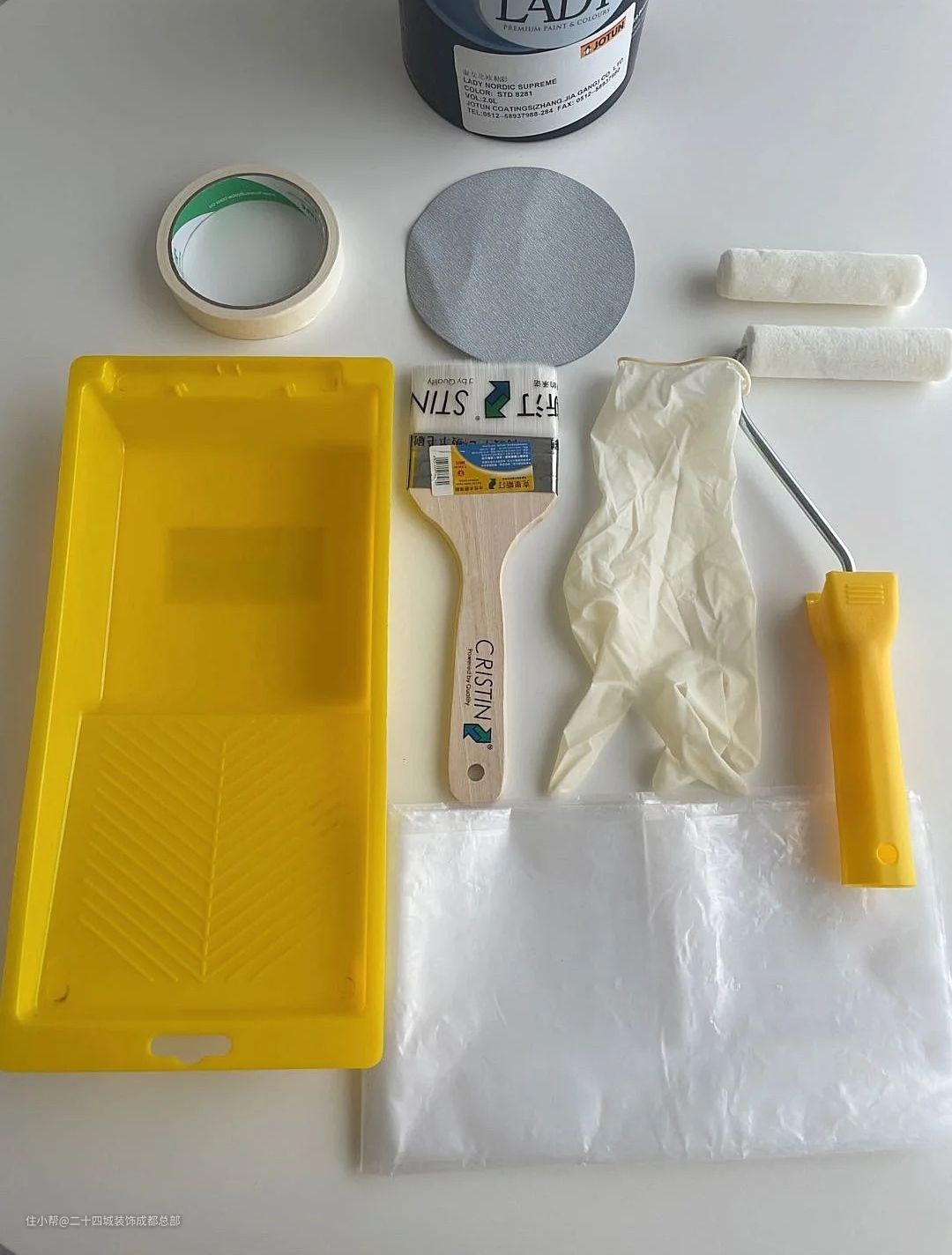 准备工具:砂纸,滚刷,美纹纸,防尘膜,一次性手套,还有个装漆的容器。