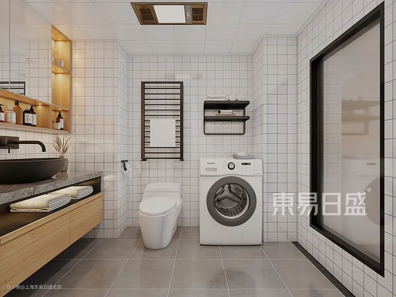 卫生间硬装上整体选用了小方砖进行铺贴,让整个空间更具秩序感。大体量浴室柜的设计满足浴室储物的需求,镜柜的处理也更加舒适大气,既能够延展视觉空间,又满足实用性的需求。