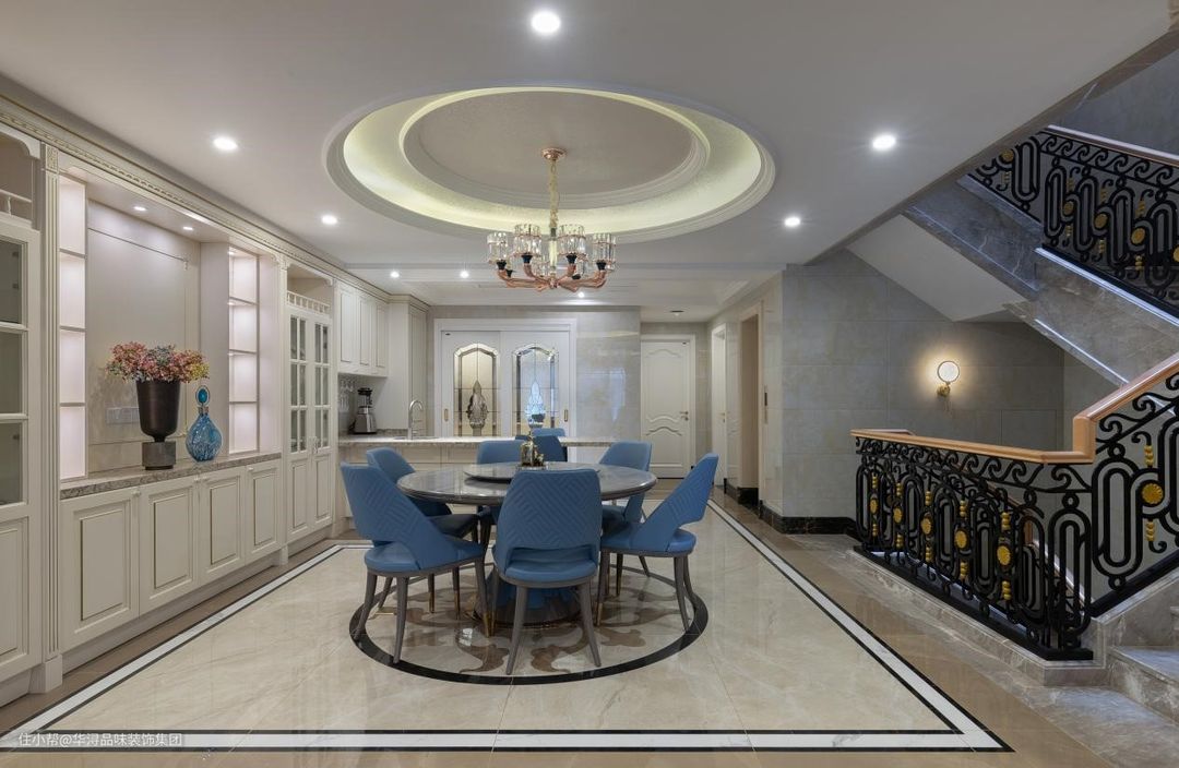 餐厅的采用通过瓷砖的隔开,区分餐厅与其他空间,圆形的吊顶,搭配圆形的大理石餐桌相相呼应,大理石餐桌非常的高档,带转盘的设计也很好看。