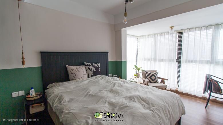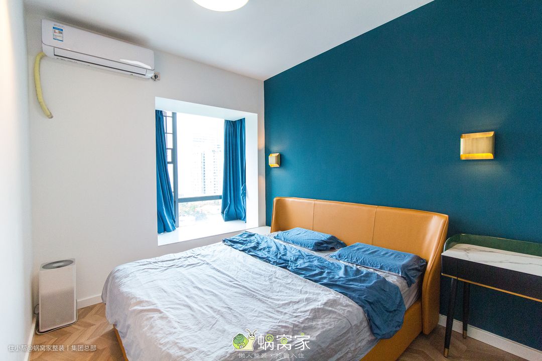▼偏青蓝色的软包床头,与天空蓝的窗帘颜色相近,却也有差异,搭配床头的饰画,空间瞬间被点亮。
