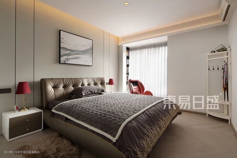 红色的床头台灯,让空间更富有活力气息,床边的毛毛地毯,柔软、舒适。床头背景墙采用简单的纯色面板进行装饰,配合艺术画作,简约又不单调。