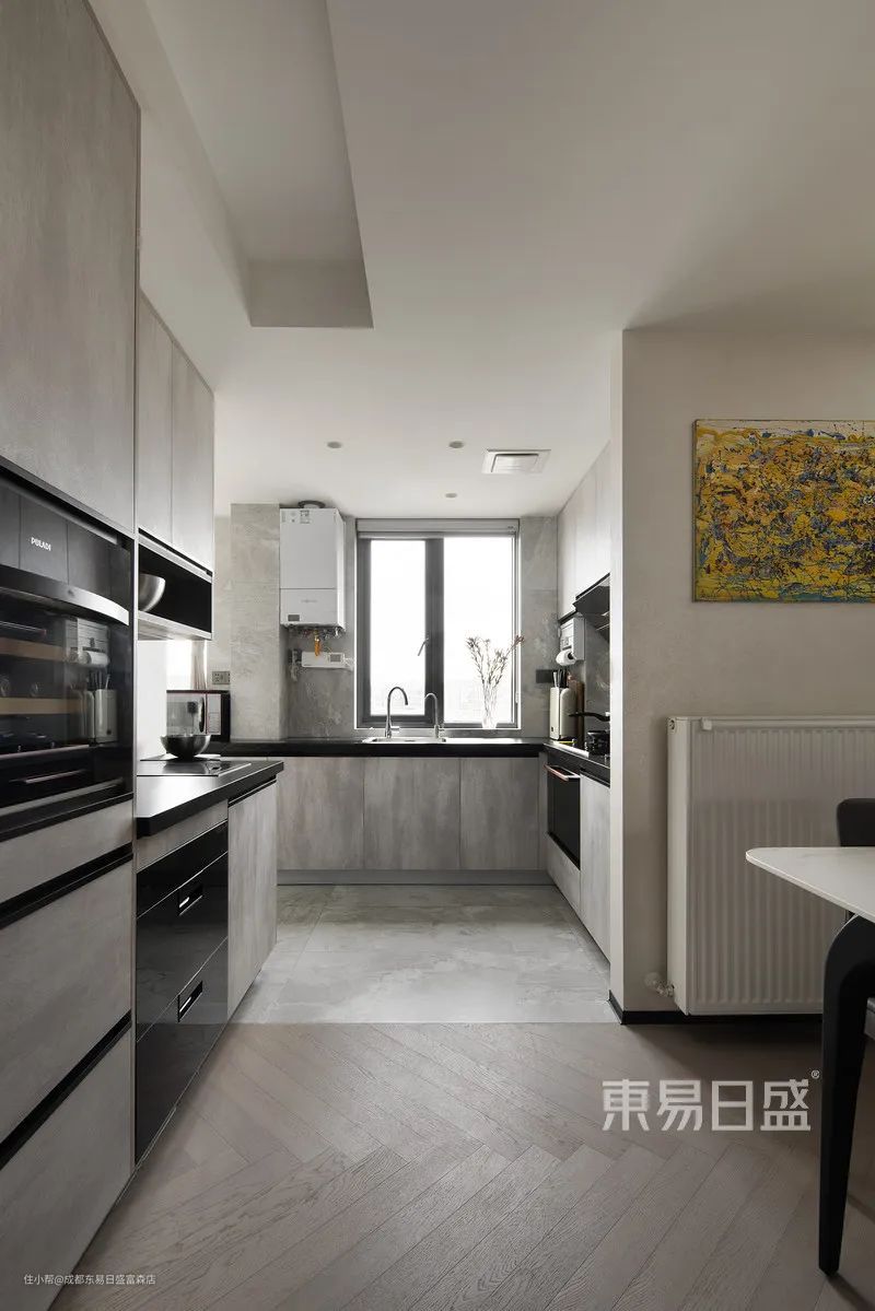 厨房设计了中西厨,整体为L型动线。西厨区域呈现C字型,到顶柜子,上下收纳功能强大,中间内嵌一个蒸箱,西厨台面区域采用黑色大理石面板进行装饰,在低饱和度柜子的衬托下,空间有一丝奢华的质感。
