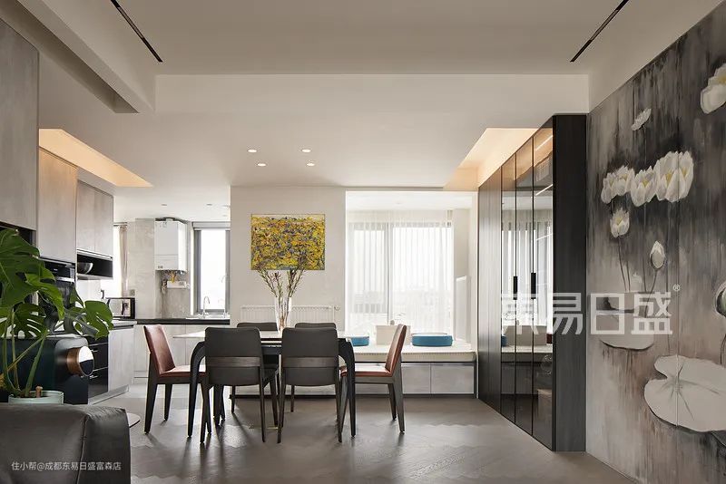 餐厅设计了一个6人餐桌 ,大理石质感的餐桌台面,配合灰色系椅子,空间简约大方。餐边墙面放置了一副明亮艺术的画作,点缀了空间,让空间更有活力。