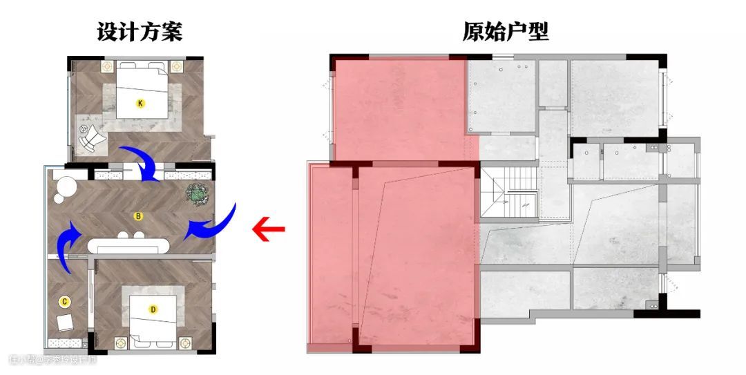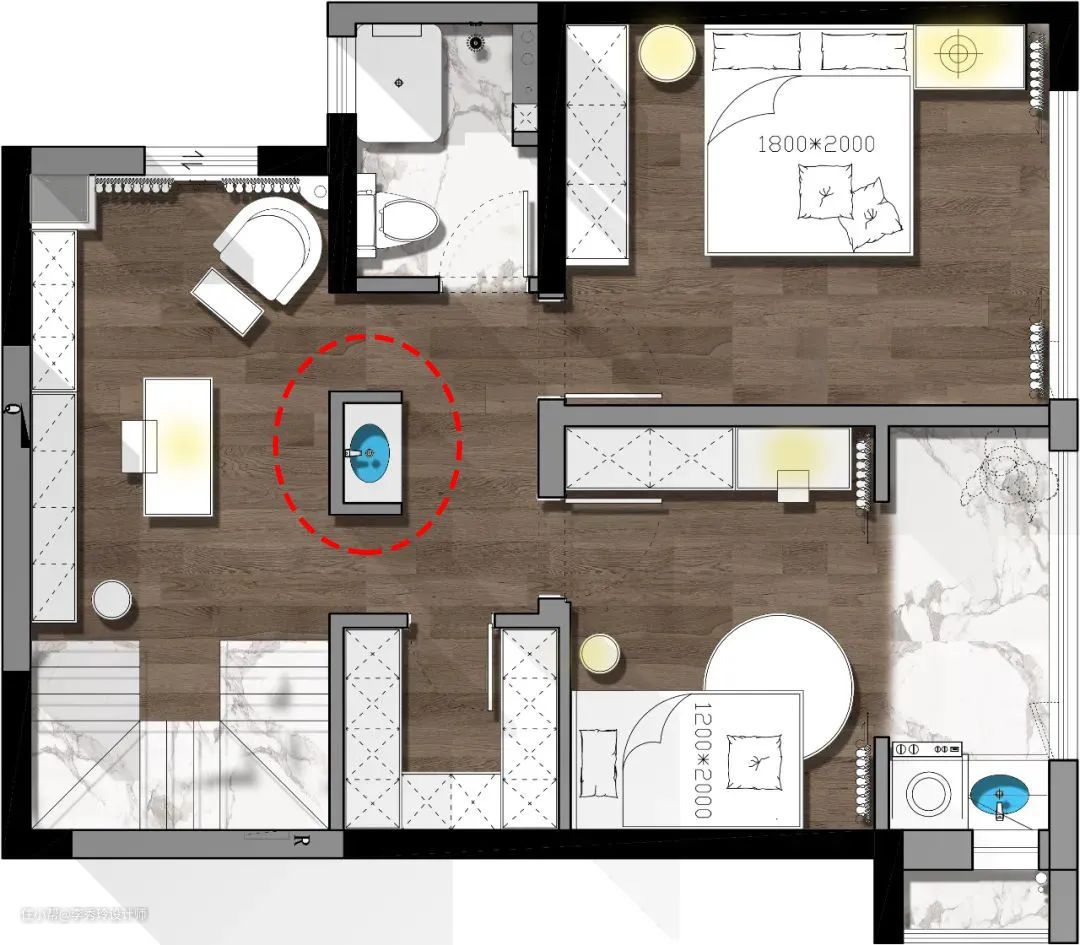如上这个案例,洗手台独立出卫生间后,安排在主卧与次卧以及餐厅之间。这样洗手台就可以作为一个中岛,不管是起床后洗漱,还是餐前餐中餐后洗手,都很方便。