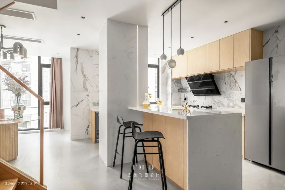 与餐桌结合时,岛台会比餐桌高10-20cm,因此,在岛台这面,也可搭配高脚凳。