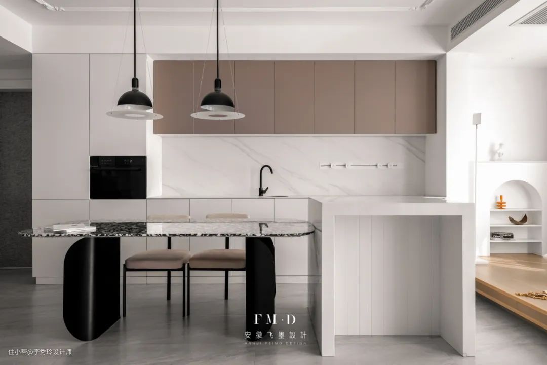 若是餐厨一体的设计,可以在餐桌与厨房中间加中岛。