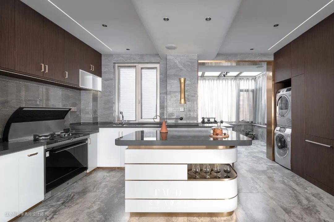 若是开放式厨房,中岛可设计在餐厅与中厨区之间,既可以做隔断,也可做厨房与餐厅的过渡;在功能上,还可以做西厨区、简餐区使用。