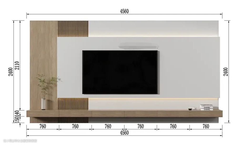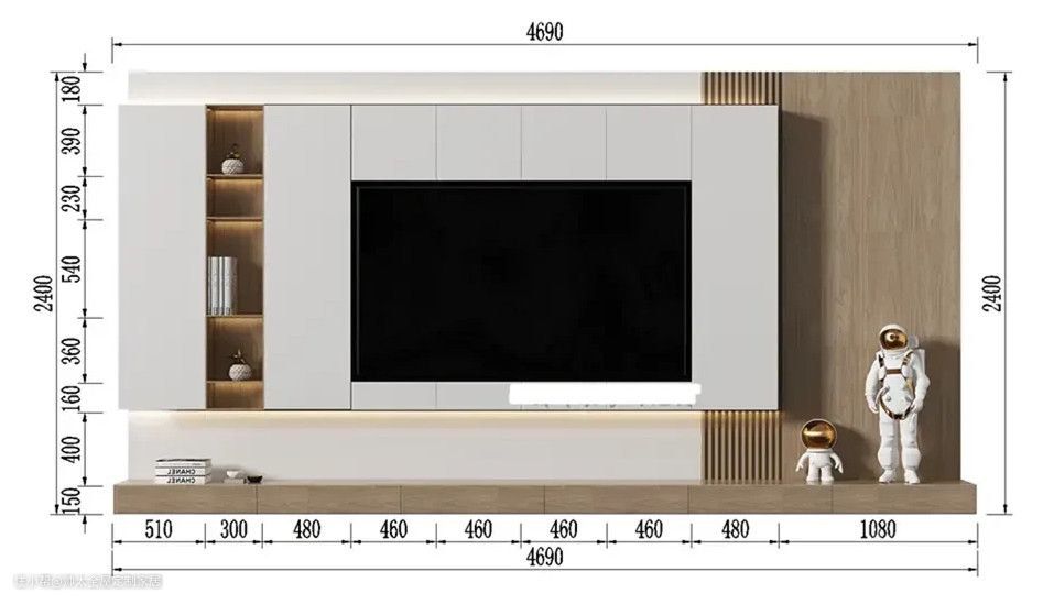 第二款在第一款设计的基础上,电视周边加上收纳柜设计,增加更多的收纳储物空间!