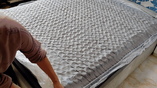塑料包装有两层,用附送的小工具先划开外层,床垫放好之后,再划开内层。划开包装5-10秒左右的时间,床垫就释放自我了,一边割内层包装,一边膨胀。