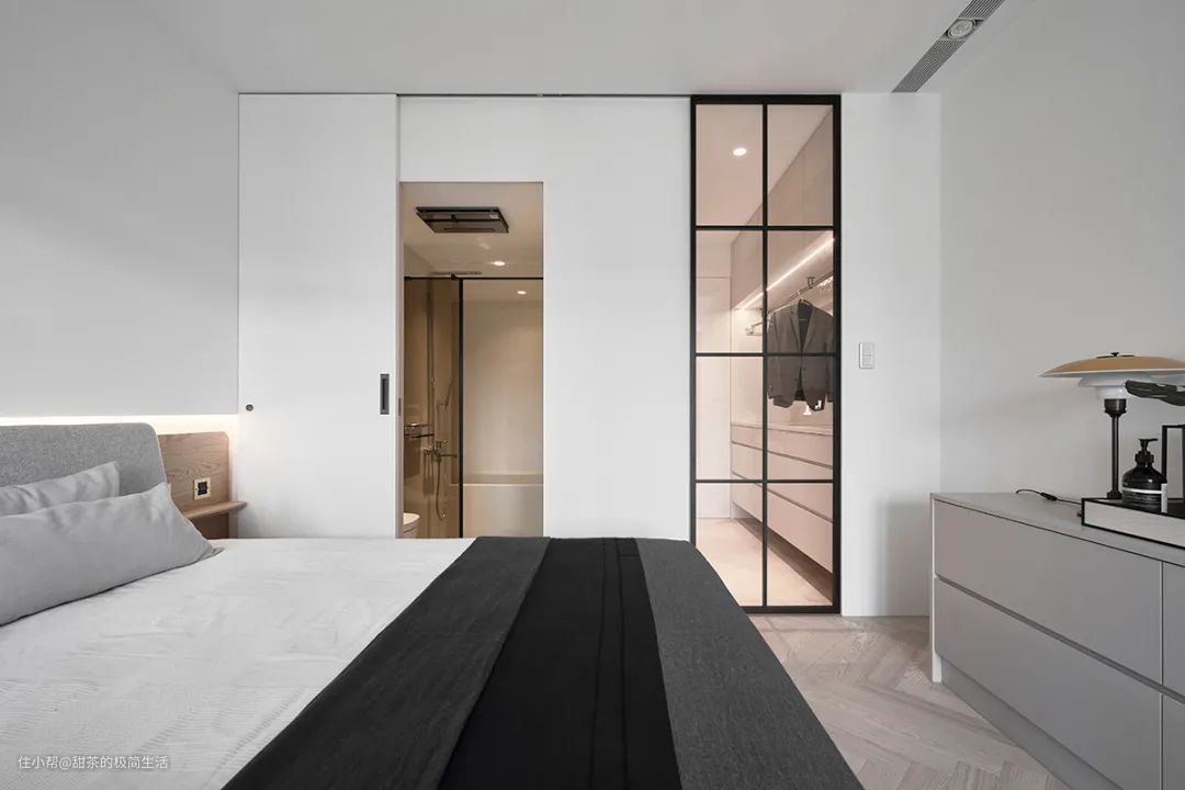 主卧自带独立卫生间和衣帽间,入口均安装了轨道滑门,从视觉上形成了一定的延伸效果。