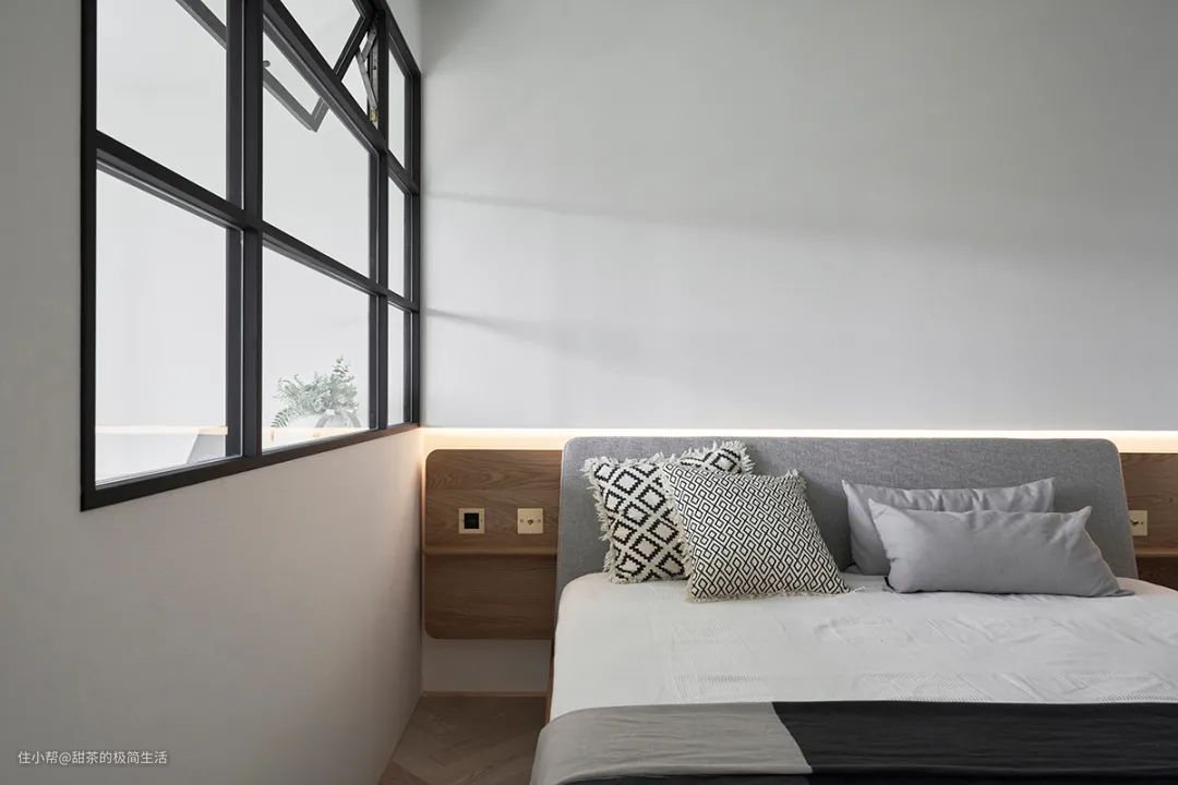 床头部分用木饰板做了一体式设计,两侧置物板代替了床头柜的功能,在隐藏式灯带的隐藏下,显得格外简洁干练。