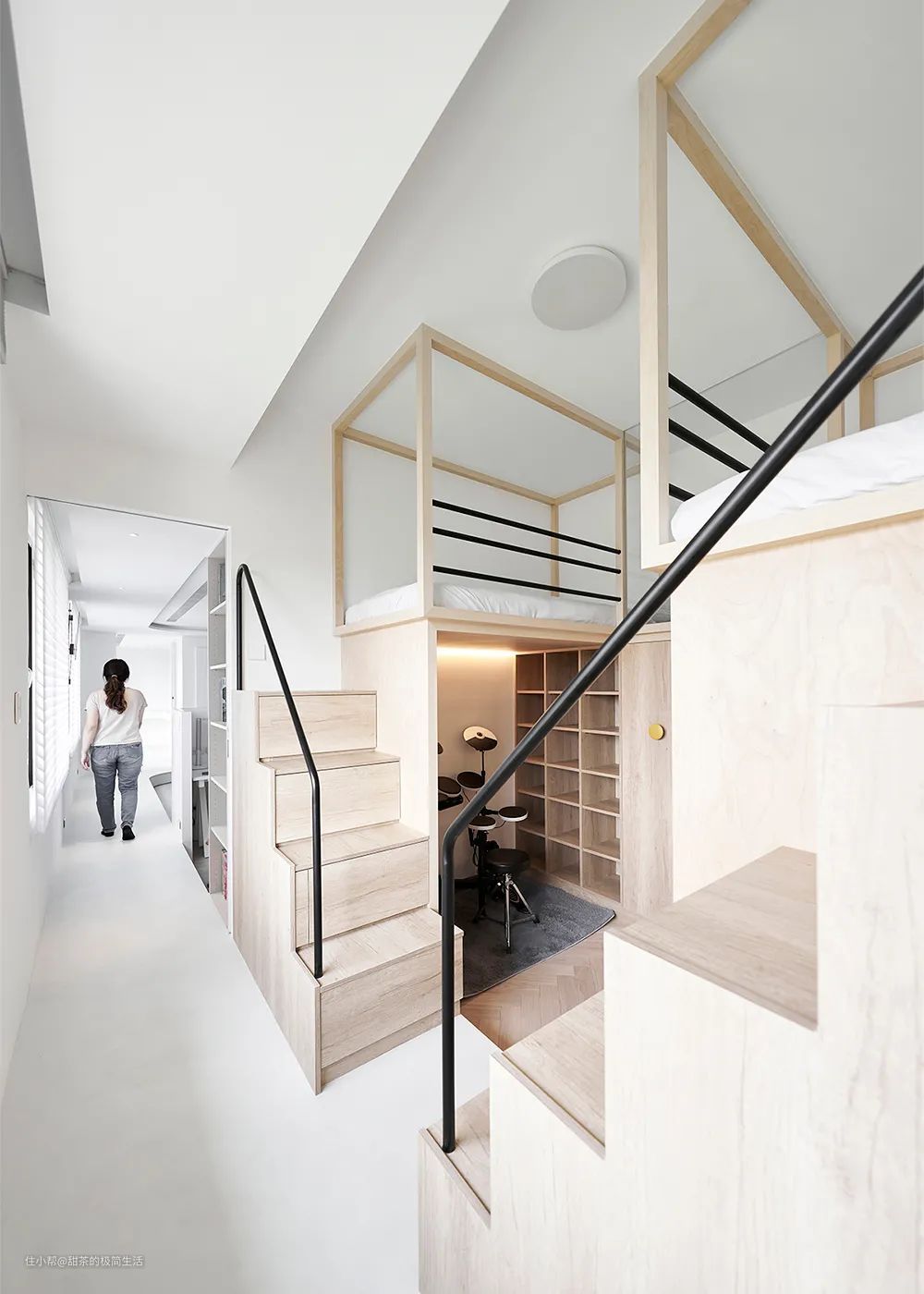 两个孩子的床铺位于卧室的上方,可以从侧面的抽屉爬上去,抽屉内也有一定的储物空间,用来收纳孩子们的内衣和袜子。