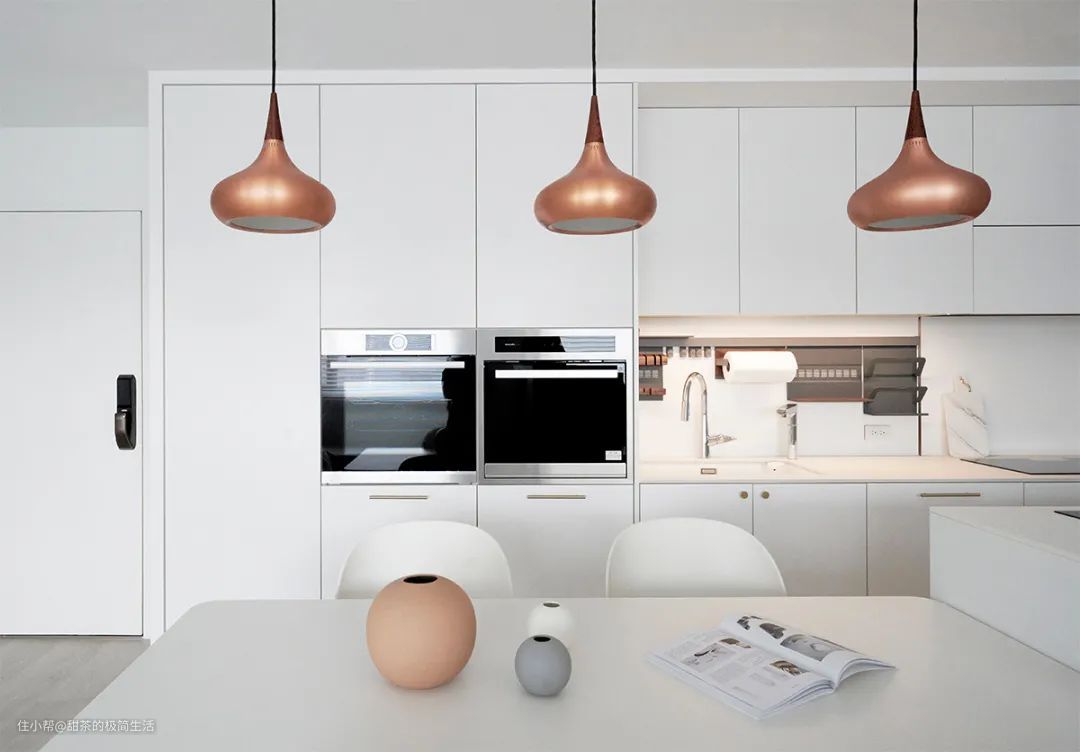 餐厨规划了丰富的储物空间,包含收纳高柜、橱柜和中岛;烤箱、蒸箱等厨电,都做了嵌入式设计,美观又节省空间。
