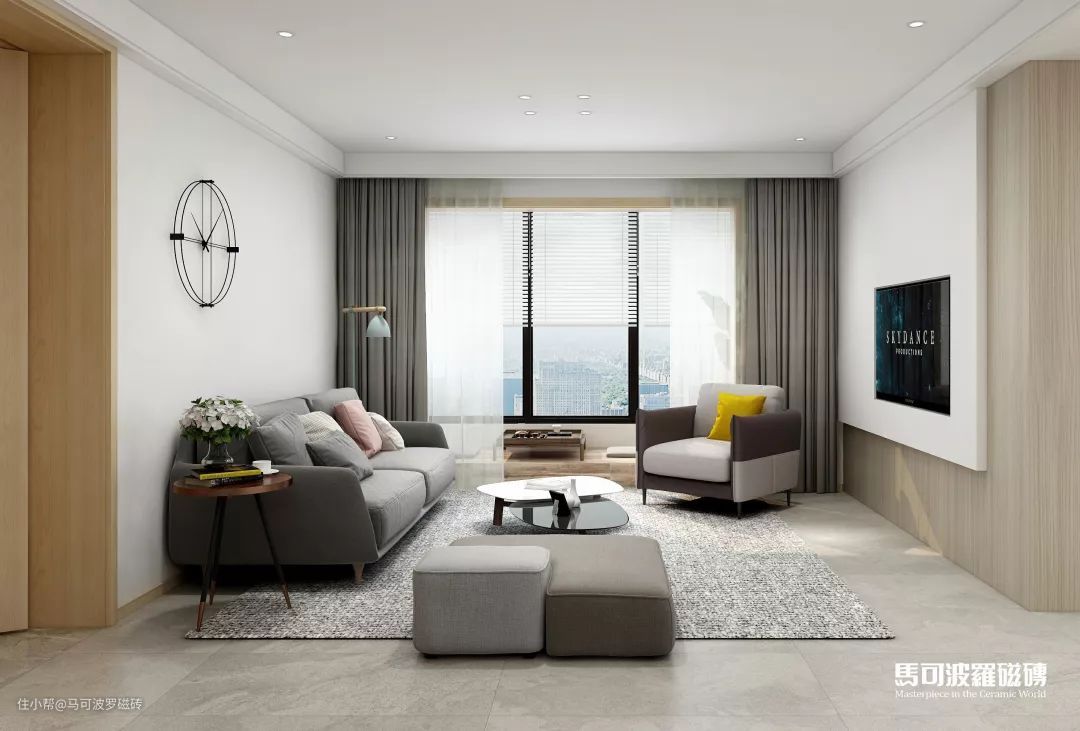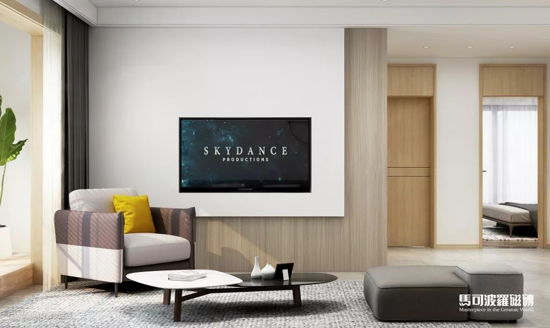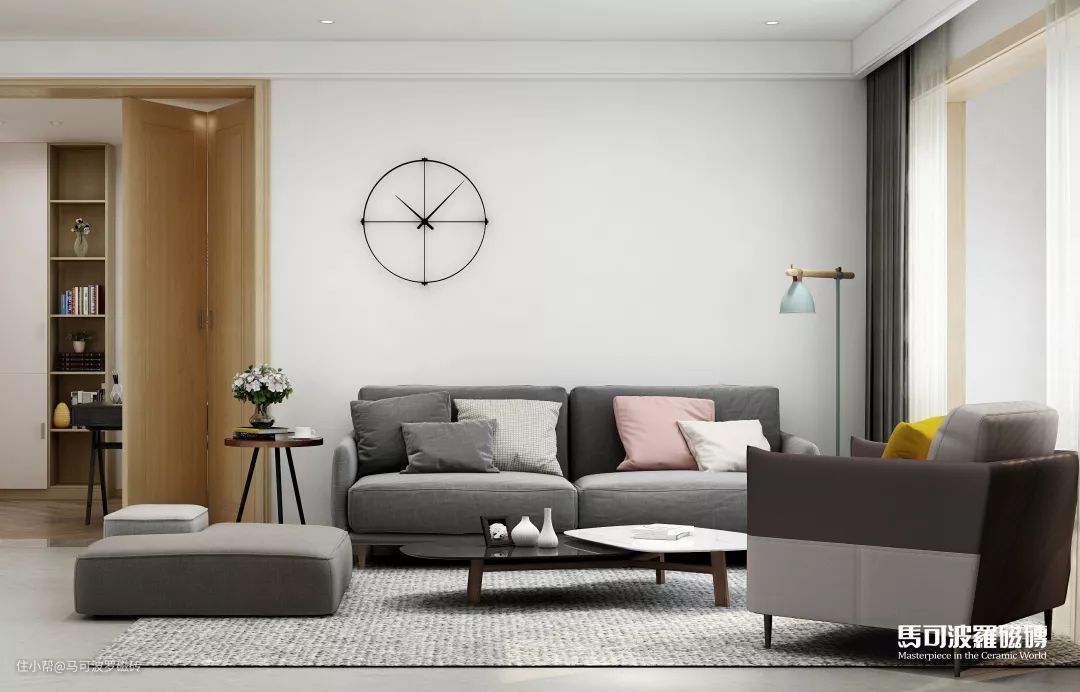 客厅地面选用马 可 波 罗米希尔,海浪般的纹理,体现着自然文化与匠心艺术的结晶。静看清风自如来去,阳光倾泻而入,享受空间视觉的延伸带来的惬意舒适。