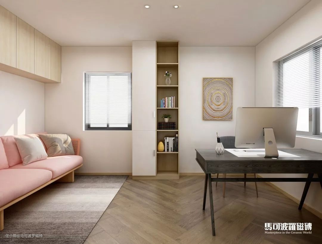 书房、卧室的地面运用马 可 波 罗 维卡,采用人字铺贴,设计感十足,优雅大气,营造出温馨、和谐的舒适氛围。