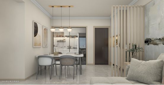餐厅色调柔和的吊灯+两张简约艺术画融合了当代的简约气质,平和舒缓,似乎只要看一眼便能感受到它的舒适。浅木色+石材结合,虽然没有太多色彩,但餐厅整体不单调,反而给人一种在餐厅就餐轻松、自由感觉