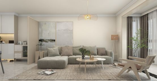 开放式的客厅以奶油白色系搭配浅色的L型布艺沙发,在自然光线和暖色灯的照射下呈现了舒适宁静客厅。原木制造的圆形形状的茶几与整体的协调更能体现出自然的韵味,细节之处更显设计者的细致入微。