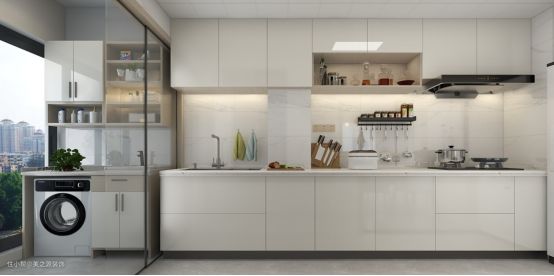 厨房内的陈设简单大气。L型厨房设计平直线条,清醒自然的白色调,仿佛这里就是女人心灵的净土。白色到顶橱柜搭配阳台外面滚筒式洗衣机,给人愉悦空间感,可以放大厨房空间,又加强阳台空间相互贯连性。