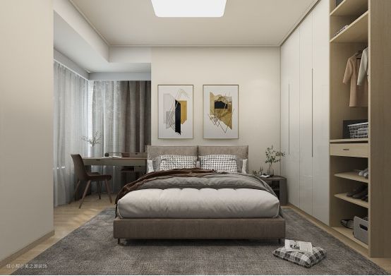 现代简约风格的卧床简约时尚,摒弃繁杂的装饰,非常符合当代年轻人的实用理念。艺术画、地毯的颜色与居室整体协调统一。垂直L学习区,呈现设计师出别出心裁的创意姿态。设计师改变了主卧的沉闷感,置身其中给人一种积极向上之感,让业主感受到生活的趣味性。