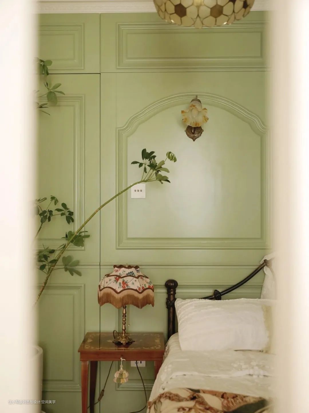 法式墙面搭配原木色地板,空间的设计感复古十足。白色透明的床帘,搭配古典元素的毯子,几许绿植点缀仿佛置身丛林。