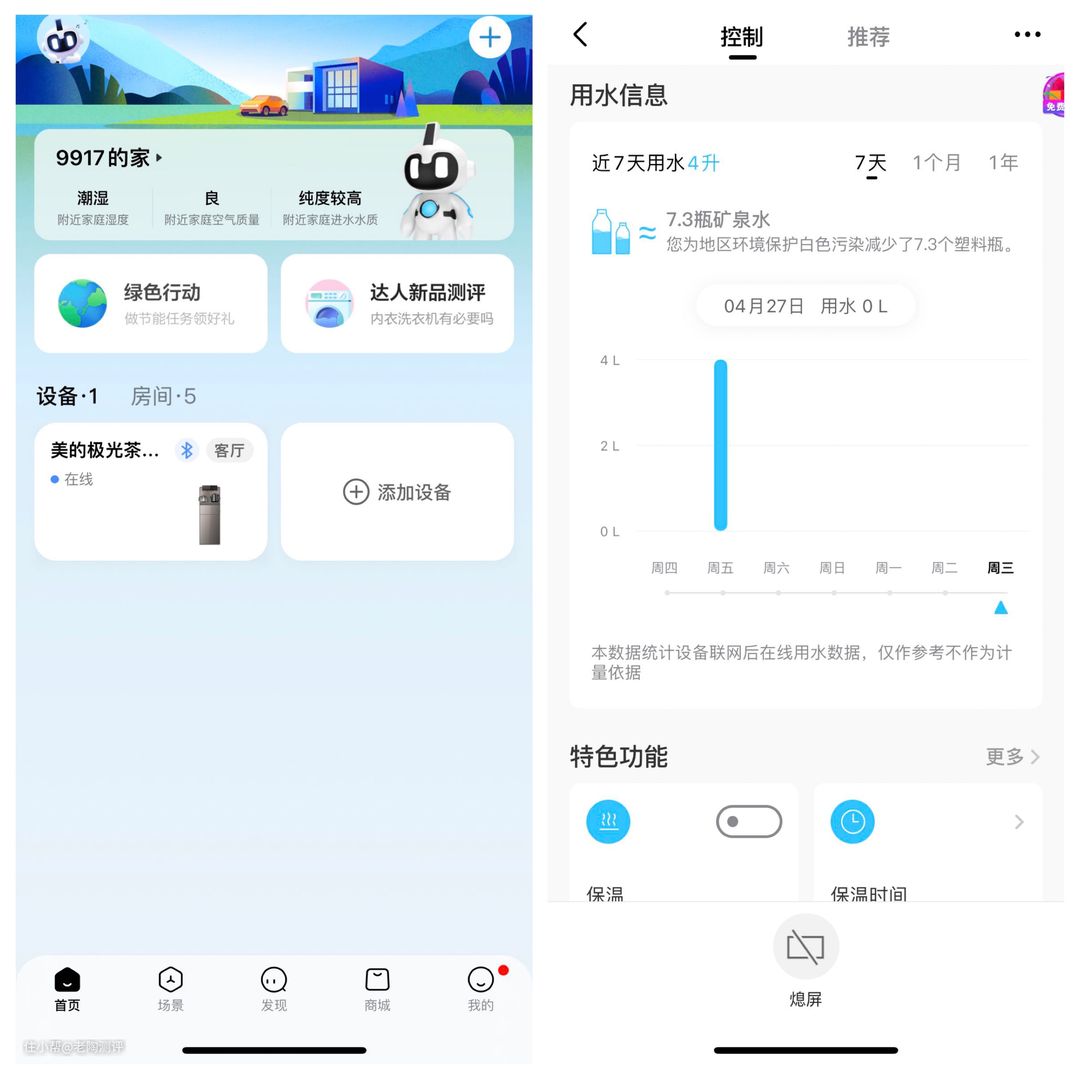 但遗憾的是海x并没有把茶吧机纳入到“海x智家”APP上,而美x则支持连接“美x美居”,我来重点说说连接后都有什么用途。