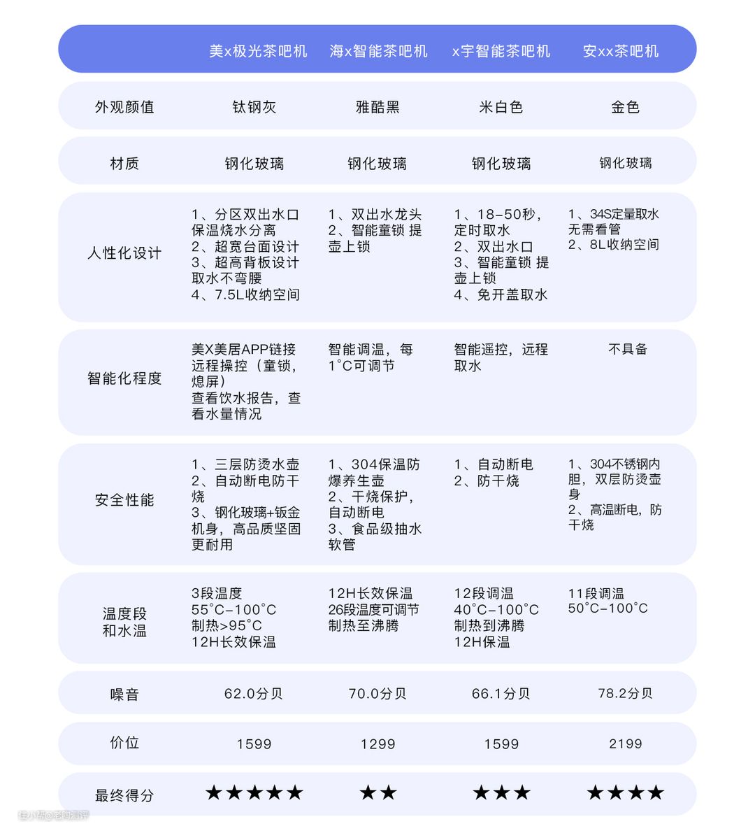 我们来看看这四款茶吧机到底符不符合上述的条件,分别记录并绘制表格