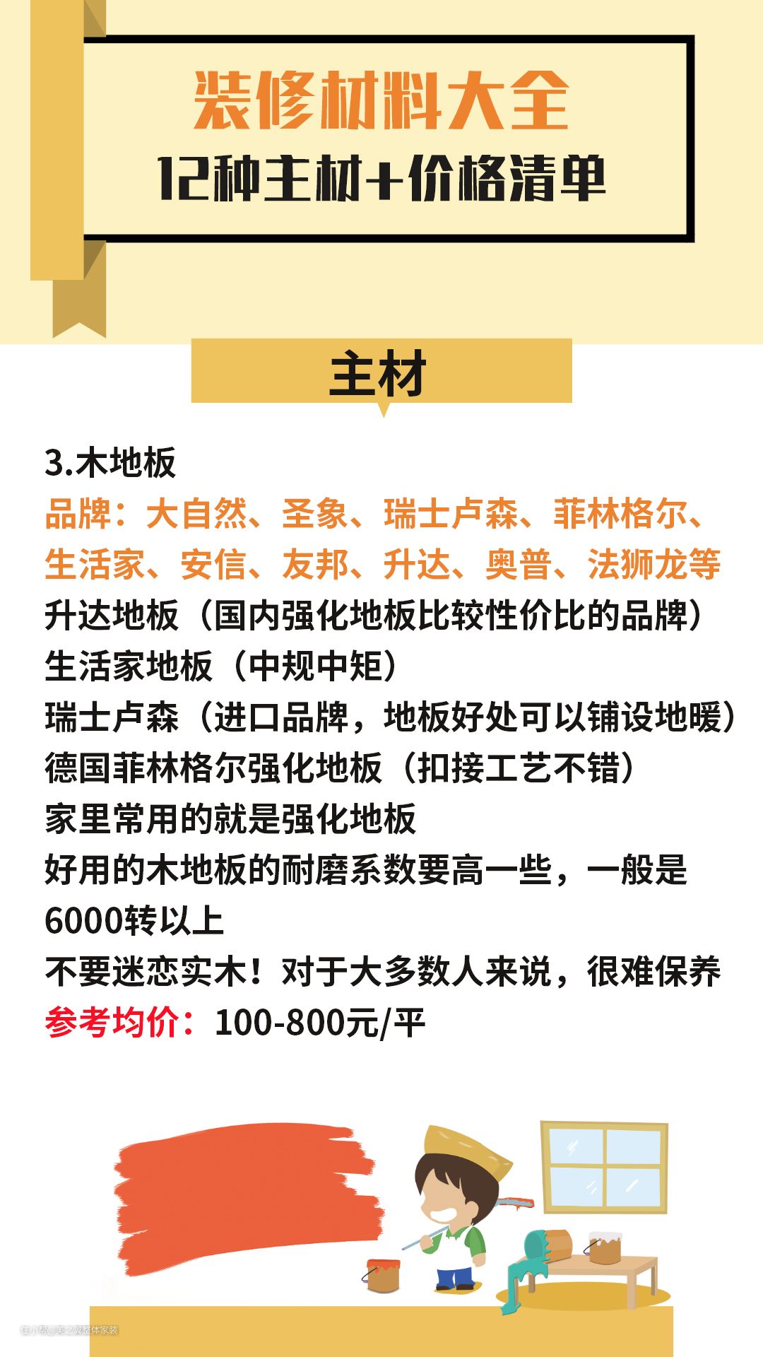 装修材料大全 12种主材+价格清单!美之翼整体家装2022-05-25虽然都说一分钱一份货,但是很多人都子买材料这一块吃了亏,今天就带大家认识一下一些主材的价格,收藏起来,万一以后用的着呢!点赞收藏关注哦~