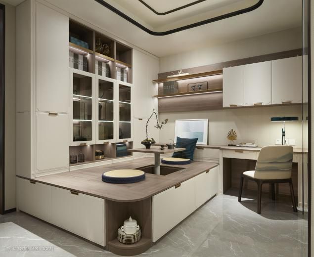 升降台设计是一个亮点,可一键式切换休闲与睡眠模式,休闲阅读区与客房功能随意切换。升降台可做书桌也可用作茶几,加上大容量的书柜设计,轻松营造一个舒适的阅读空间。