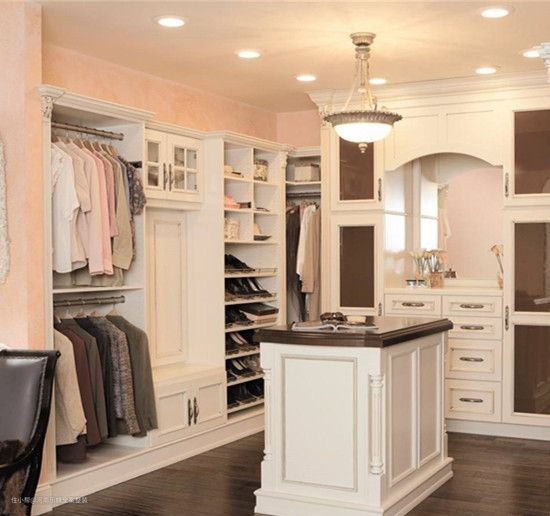 3、步入式衣帽间可与悬挂区的设计相分离,如短衣服的悬挂空间较小,衣帽间只有0.94米高,而裙子之类的衣服占用空间较大,因此衣帽间高度以1.8米为宜。
