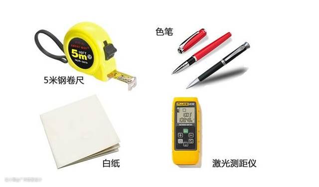 量尺是需要专业工具进行辅助的,出发前要打印一两份房屋户型图纸,带上长度足够的卷尺、四色笔(或两支不同颜色的笔)、激光测距仪(测量层高、进深、开间)等工具。
