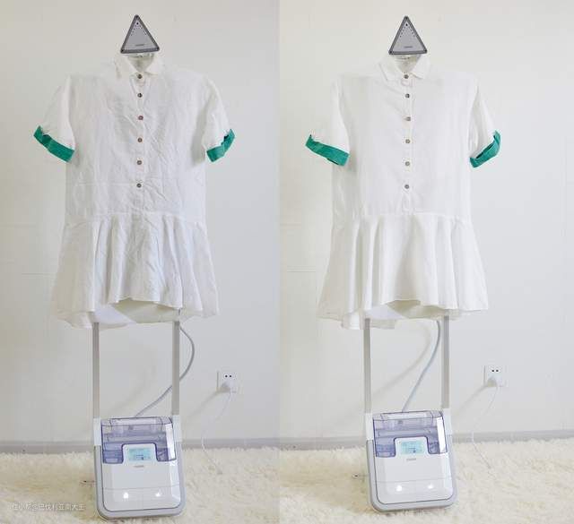 看下对比,是不是很夸张?!整个过程毫无水珠产生,熨完直接就能穿。这也是增压挂烫机的一大好处,强劲蒸汽射流,喷气不喷水,高温高压干蒸汽还能杀菌除螨去味。