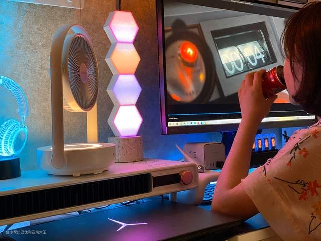 晚上睡觉的时候开着夜灯也不刺眼,而且立在桌面用也很稳。风扇可以多角度调节位置(风扇左右悬浮摇头大到90°,而且上面的风扇头可以大范围翻转,站着也能吹)。