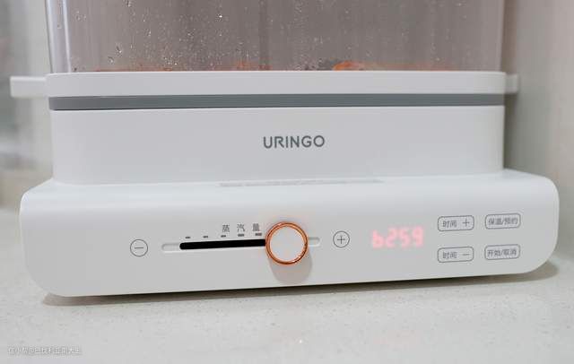 操作界面也非常简单,蒸汽量最大900W,可以通过左右拨杆控制出气量的大小,不同食材设置不同蒸汽量。右边是保温/预约/开始/取消键,触控操作,反应灵敏,老人也能轻松驾驭。