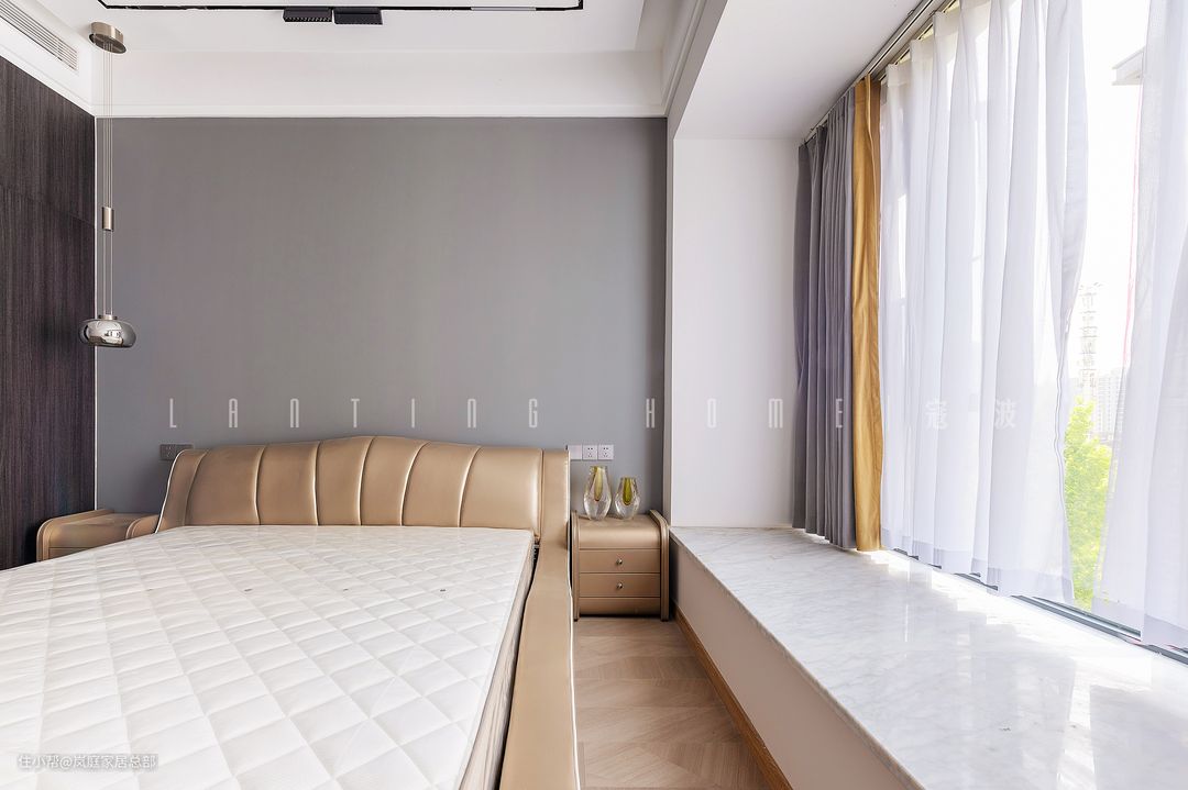 卧室灯光采用暖色调,柔和硬朗的硬装空间。