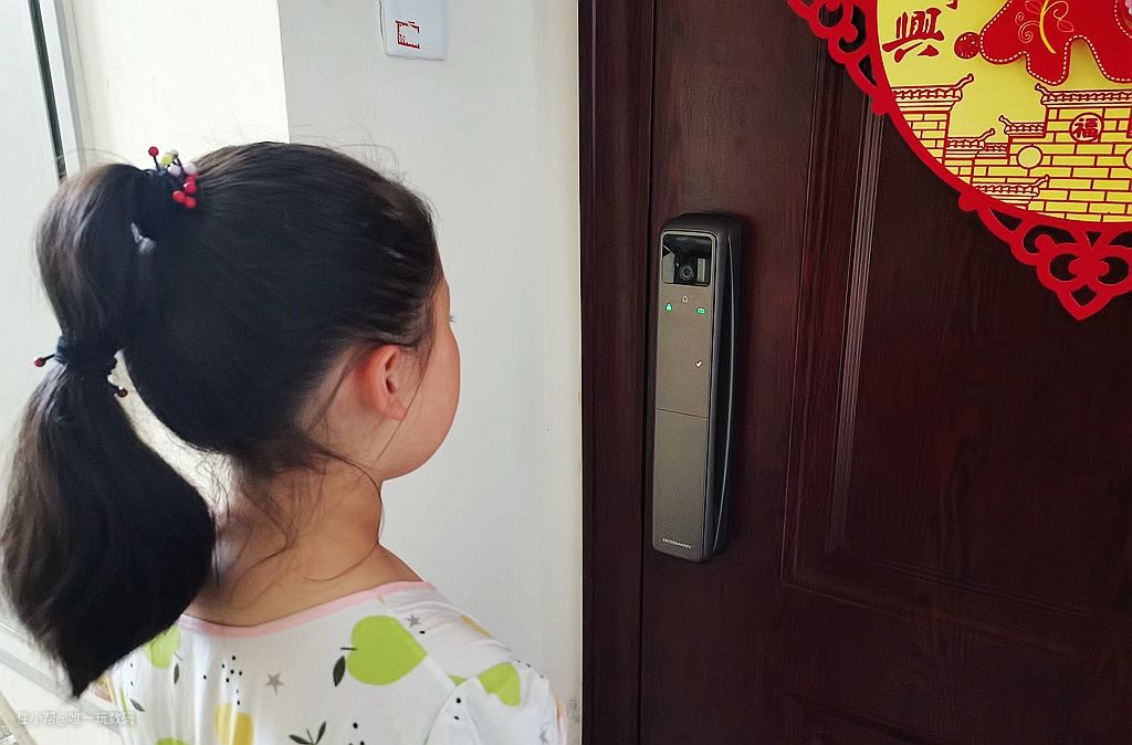 3D人脸识别固然很好,但是指纹识别和数字密码也是我们居家生活经过会使用的开锁方式,德施曼Q50FPro采用了内隐式指纹头设计,搭配活体生物指纹识别传感技术,能够快速精准地识别指纹,安全性、指纹识别速度、功耗方面表现都非常出色;实际让小朋友进行验证指纹解锁,指纹识别率非常高,当小朋友的食指接触到指纹头后,门锁自动打开。
