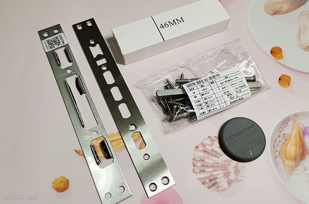 德施曼智能锁Q50FPro整体配件十足,前后面板、C级锁芯、锁体、导向片、5000+2250mAh双锂电池、机械钥匙、螺丝配件包、防撞贴、防夹手挡板、安装开孔图和产品说明书。