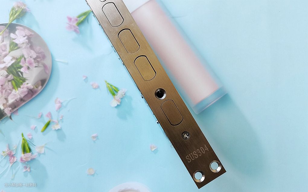 锁体上方德施曼LOGO非常清晰,而且从侧面可以清晰地看到多个锁舌。底部带有标识“SUS304”代表的不锈钢材质。