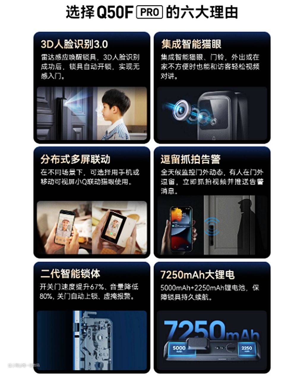 ①3D人脸识别3.0,实现无感开门;②集成智能猫眼,轻松视频对讲;③分布式多屏联动,可视屏搭配更便捷;④逗留抓拍警告,全天候监控动态;⑤二代智能锁体,开关门速度提升;⑥7250mA锂电池,持久续航。