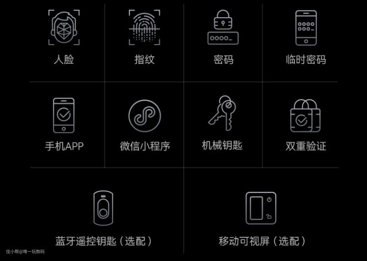 德施曼智能锁Q50FPro一共有十种解锁方式,除了人脸、指纹、密码、机械钥匙、临时密码、手机APP、微信小程序、双重验证等解锁方式,还新增了蓝牙遥控钥匙和移动可视屏,当然这两项需要用户购买时进行选配。