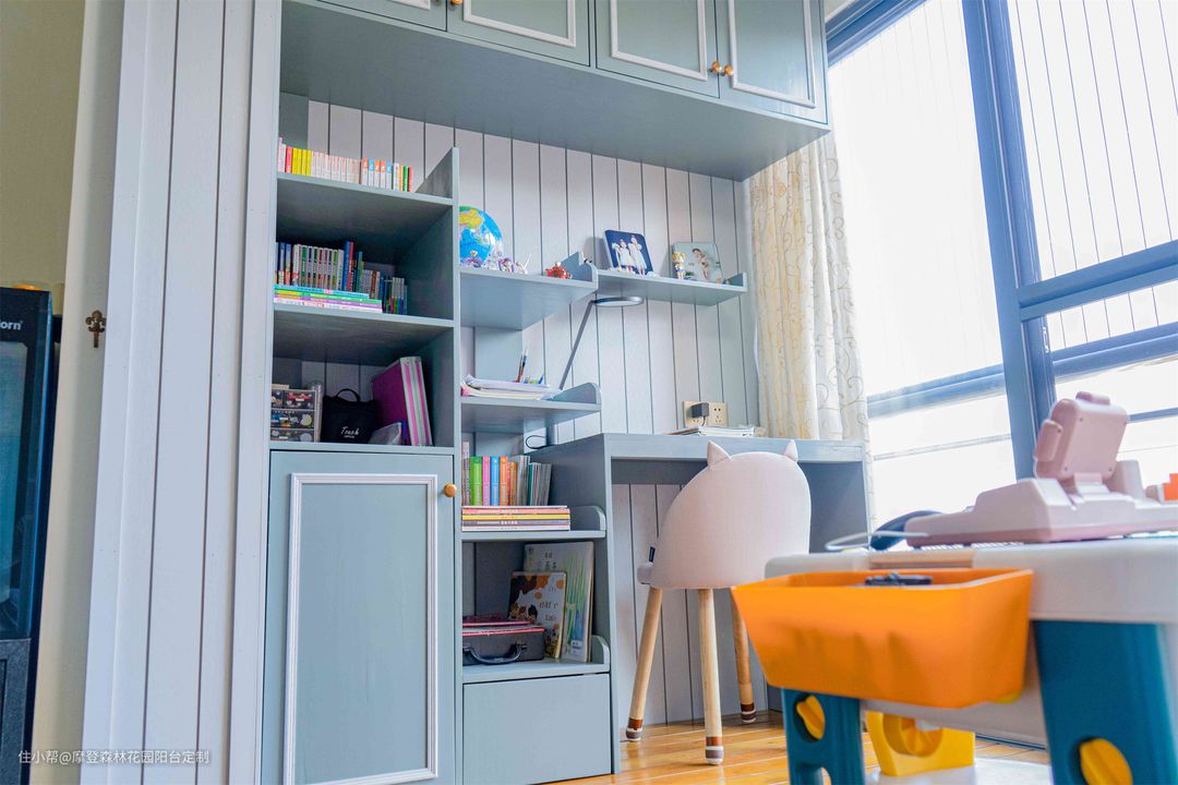 整个空间是温暖清新的感觉,阳台也成了小朋友待得最多的空间,玩具、书本都有了“安身之所”,不会经常找不着了。