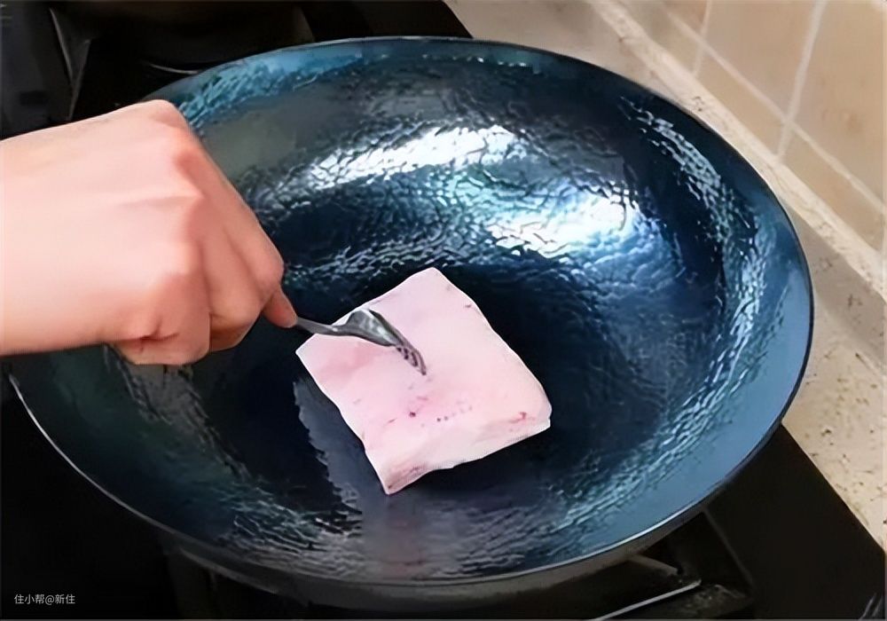 铁锅表面油膜是铁锅不生锈和不粘锅的重要因素,在我们买到一个新铁锅后,可以先在明火上烧至锅体通热,然后用肥肉反复涂抹锅体内壁,再用食用油进行润锅,等表面形成油膜后就可以正常使用了。