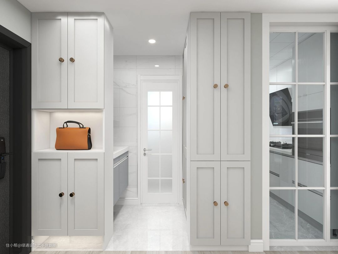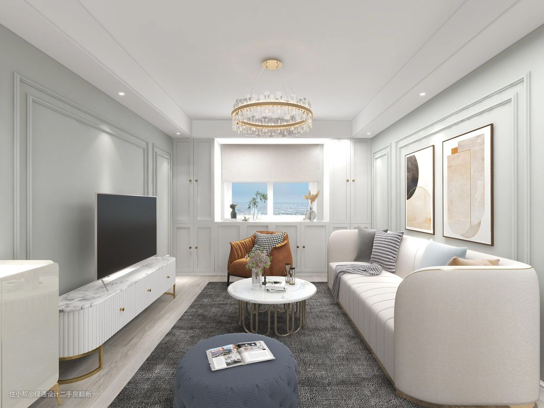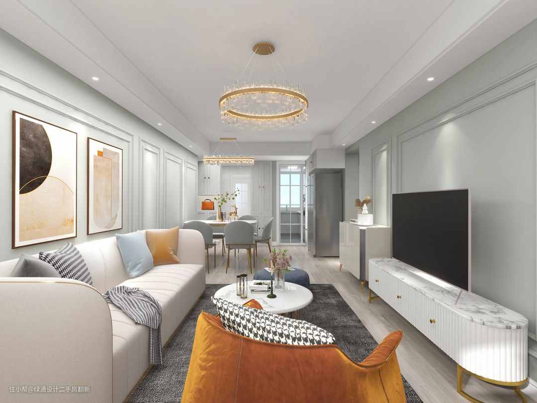 客餐厅选择浅豆绿,能够增加空间的温柔感绿通设计二手房翻新2022-05-25房屋原有的格局空间通透,采光不错,材质的选择以环保为主。客餐厅的空间整体较大,空间上原本就有很清晰的划分。电视背景墙使用简洁的浅豆绿和丰富的线条进行装饰起来,突出了电视电视背景墙而又不喧宾夺主。客餐厅的整体配色选用的是白色+浅豆绿的组合,使空间兼具温柔与时尚感。