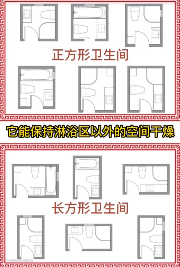 1、干湿分离,空间够的尽量做,它能保持淋浴区以外的空间干燥,减少细菌滋生,需要注意的是,有刚出生的小宝宝的家庭,如果用玻璃隔断做干湿分离湿区,要考虑再放下一个澡盆的同时,还能蹲下两个大人位置,不够的话就装浴帘吧,不要被玻璃隔断阻碍了发挥的空间,装浴帘也会给你惊喜的