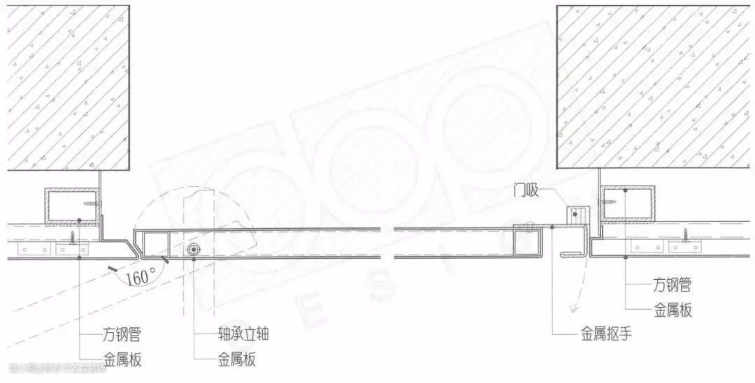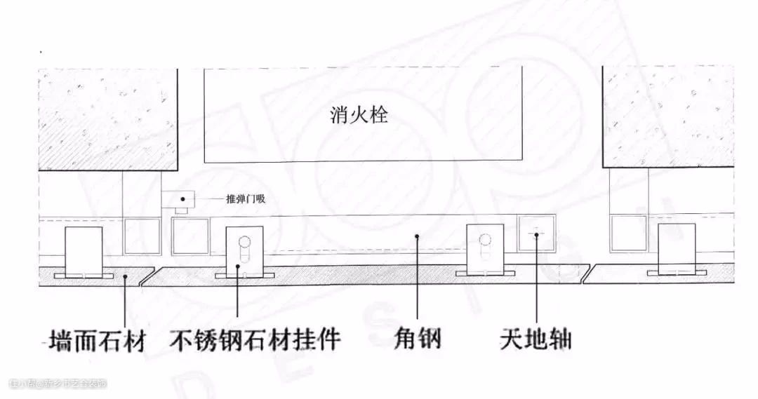 如上图所示(以石材干挂为例),它的门扇部分其实是周边墙面做法的延伸,周边材料是用什么构造做,门扇就用什么构造做。