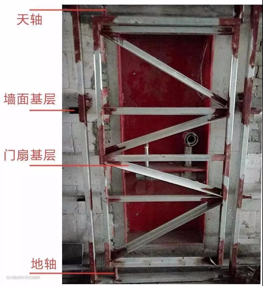 这是使用需焊接的天地轴对门扇进行开合作用。优点:承受荷载大,材料成本低,性能稳定。缺点:安装较麻烦,可开启角度小,开启不便。