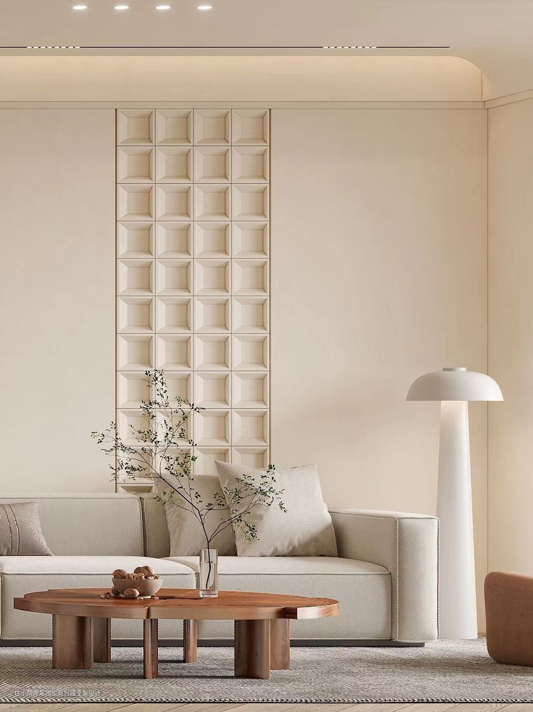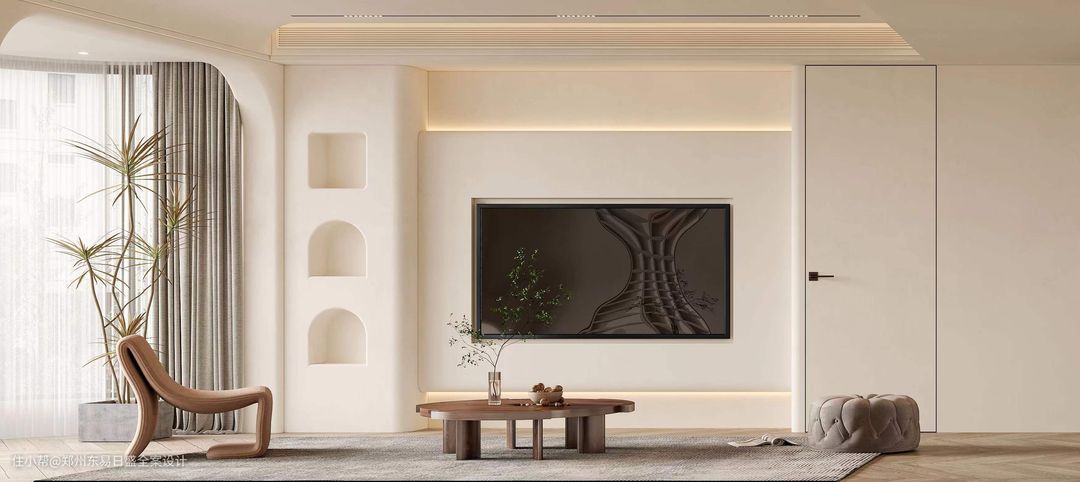 低饱和度的配色,让整体空间呈现出轻盈的肤感裸色。以弧形线条,直线和隐藏灯带来提升整体效果和质感。电视背景墙旁的隐形门 ,墙面的U形,栅格和镂空等造型让空间合理的运用并以此增加层次感。