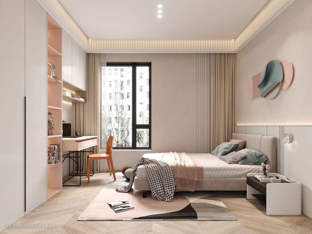 儿童房的整体风格也是温柔自愈的奶油风,书桌方向做衣柜书桌一体设计,对空间的利用率做到极致,悬浮顶 软装和灯光的搭配营造出温馨舒适的起居环境。