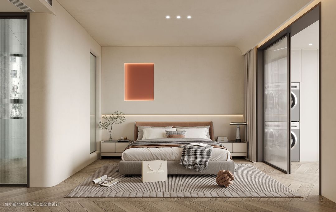 主卧同样奶油色用于整体搭配 ,吊顶和墙角弧形造型让空间又多了几分柔和 安逸,配上软装和鱼骨木地板 墙面造型加以变化。给空间安逸舒适的起居环境。