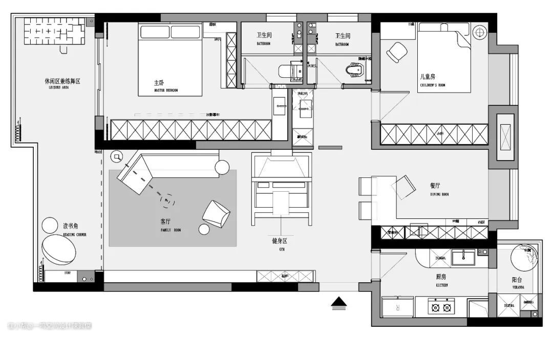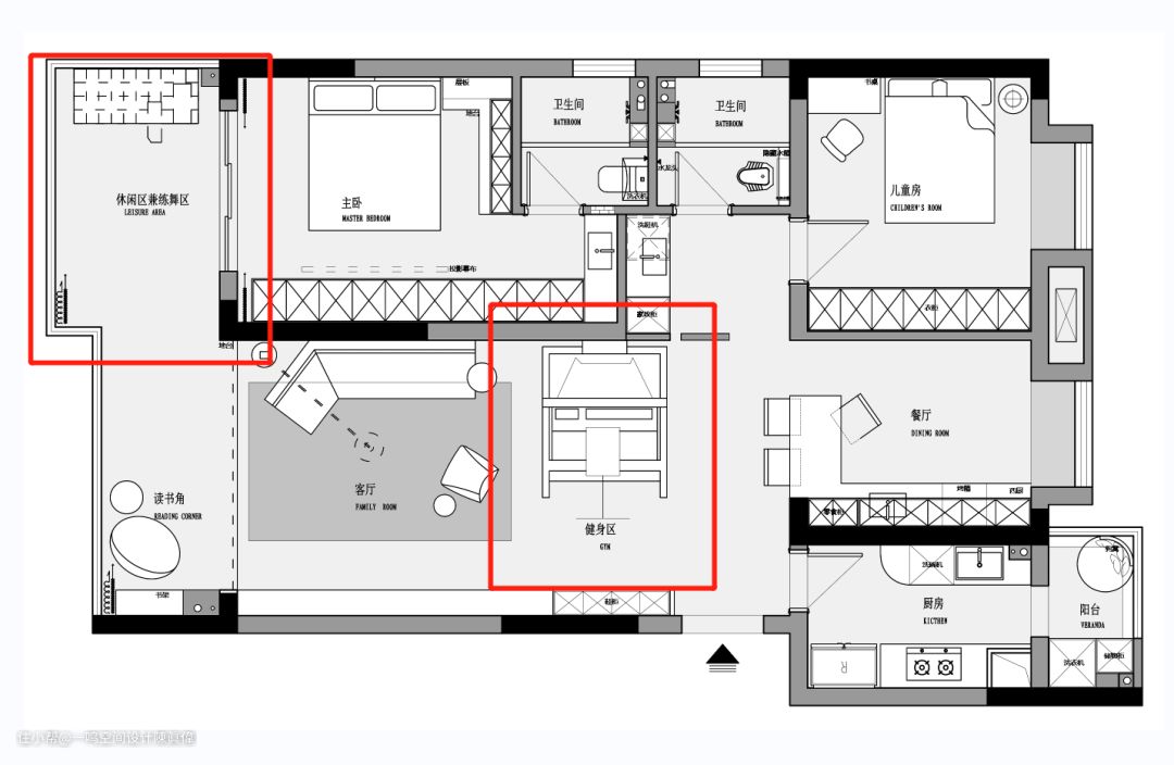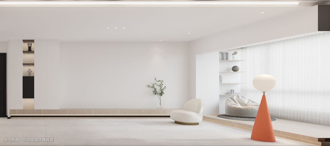 比如说上图的客厅做了一个整体的休闲空间使用,健身器材,瑜伽垫,练舞区等等。这个空间就成为了一个多功能性的叠加空间,如果说在阅读角的位置加一个书桌,又可以变为办公的区域。这种叠加又不会让空间变得很压抑,还很有效。