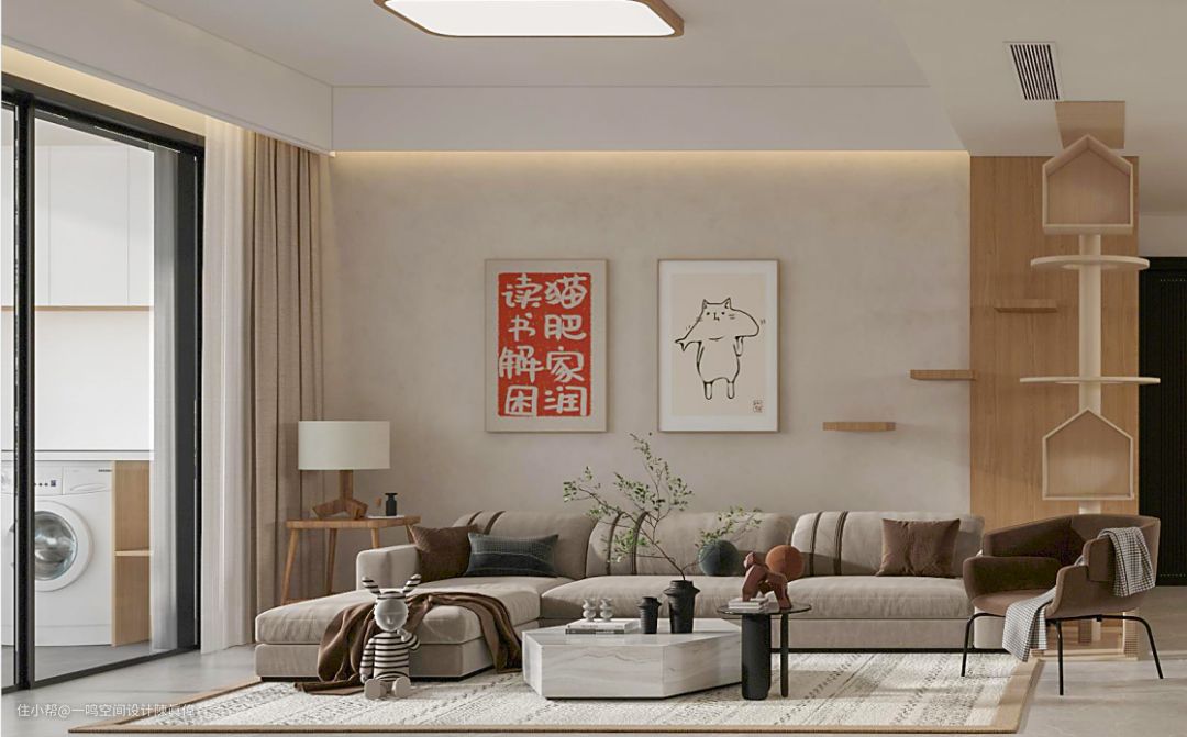 ③还有一些墙上的空间可以利用,在刚需户型的空间,一些上墙不会难看的家居和收纳都可以向墙上靠拢来争取收纳空间。比如说这套案例用墙上的空间做收纳柜和猫主子的活动空间。